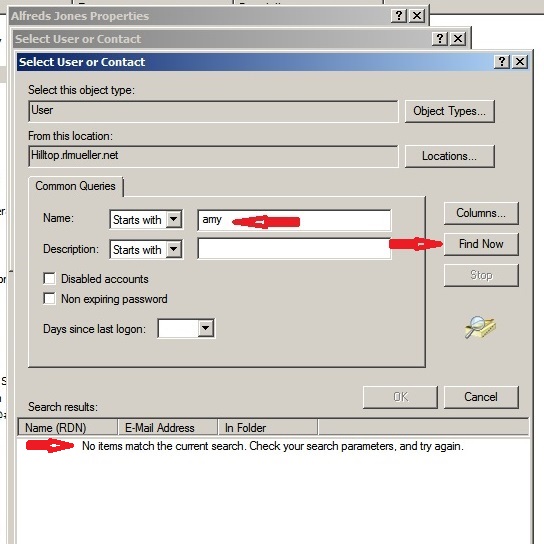 Note that users that have the string "fred" do not show up unless the RDN begins with this string. For example, a user named "Alfred Jones" (which exists in the domain) is not included in the list. However, the results are not consistent. In other cases, names starting with a specified string can be found, but similar names with a leading space never show up, no matter what string is used.