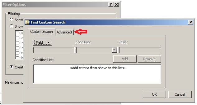 For example, in the image below "Filter Options..." is selected on the "View" menu of ADUC. An attempt will be made to find a user whose sAMAccountName starts with a leading space.