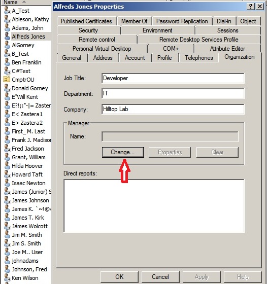 Below are the properties of a user in ADUC. On the "Organization" tab the "Change..." button is clicked to select the Manager for this user.