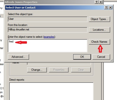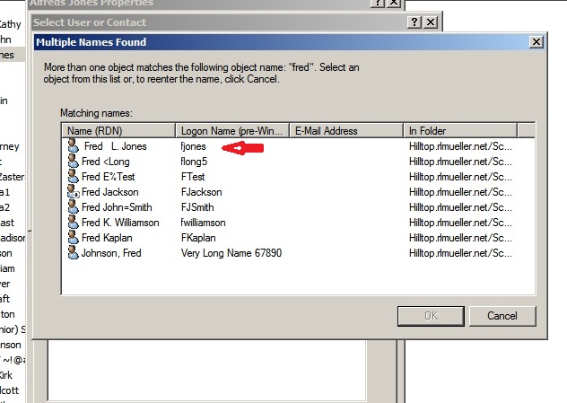 The result when "Check Names" is clicked is all users where the RDN either starts with "fred" (without the leading space), or where the string " fred" (with the leading space) appears anywhere in the RDN. The object desired is found, but so are several others. The results are exactly the same if the query uses the string "fred", with no leading space.