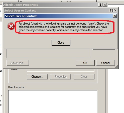 It should be rare to find objects in Active Directory with names that have a leading space. They cannot be created in ADUC, but can be created in a script. Such objects are difficult to work with. In fact, it is hard to even find them. The issue was raised in the following TechNet Windows Server forum thread Unable to add AD user as a manager, told the object cannot be found.